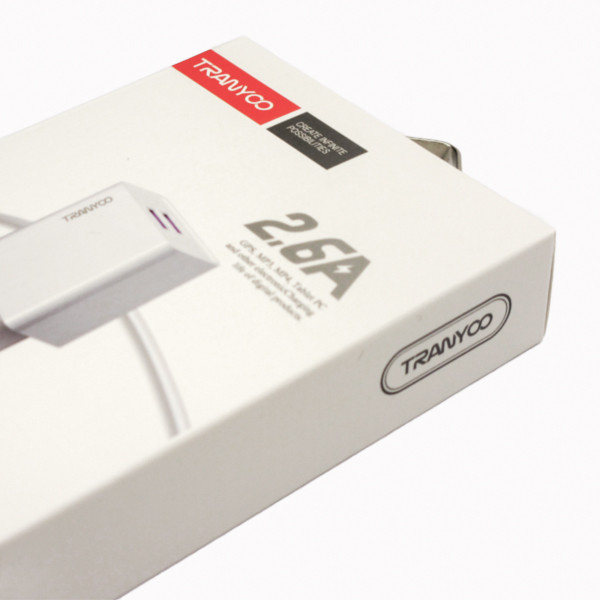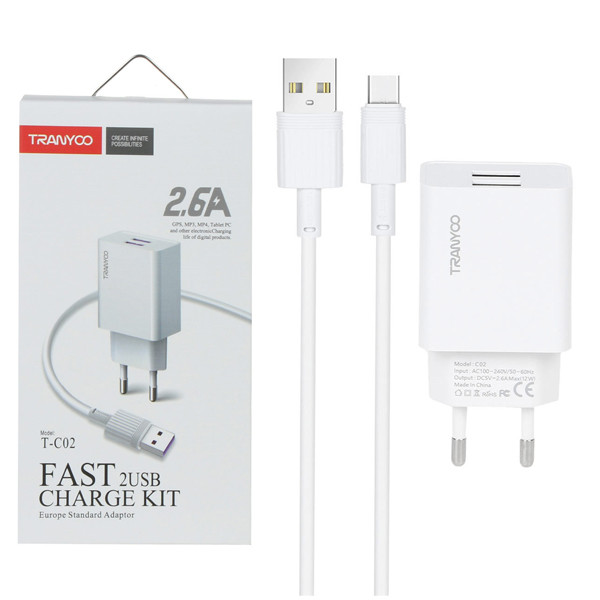 شارژر دیواری ترانیو مدل T-C02 به همراه کابل تایپ c می باشد و حداکثر جریان خروجی 2.6 آمپر مناسب برای شارژ گوشی های اندرویدی با درگاه شارژ تایپ C که قابلیت شارژ همزمان دو دستگاه را دارا می باشد.
