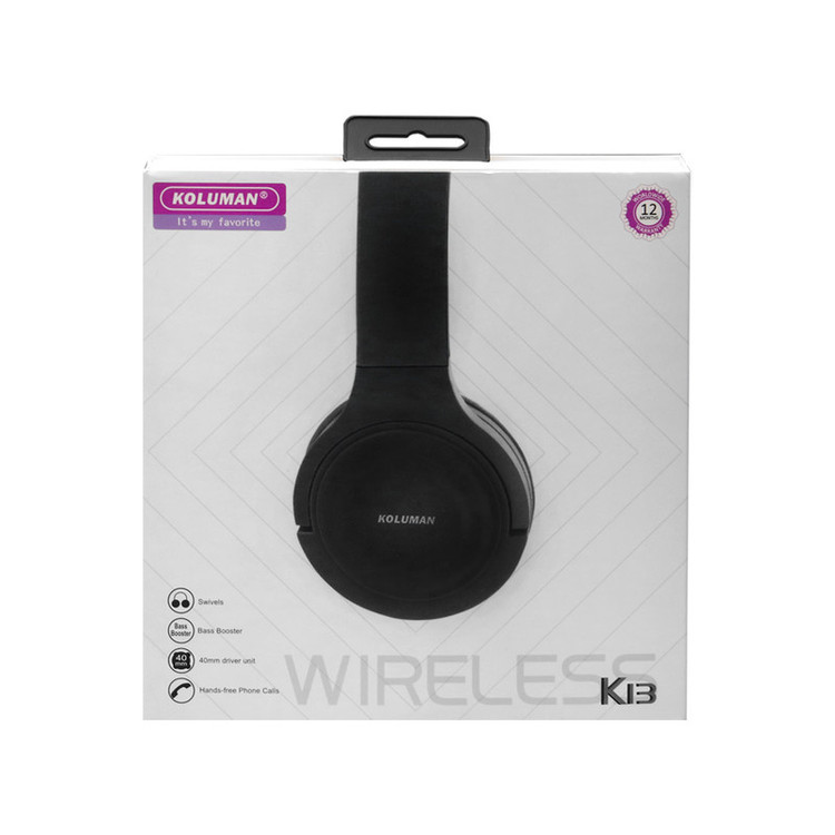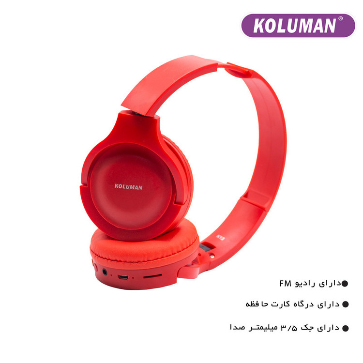 هدفون کلومن مدل K13 محصولی خوشساخت از این برند است که با کیفیت صدایی بسیار شفاف و واضح تولید شده است. این محصول از طریق فناوری بلوتوث ورژن 5 به تلفنهمراه یا پخشکننده صوتی شما متصل میشود و به کمک آن میتوان بدون ایجاد مزاحمت برای دیگران به موسیقی مورد علاقه خود گوش داد. هدفون K13 علاوه بر دارا بودن بلوتوث، دارای قابلیت اتصال با کابلAux و کارت حافظه (میکروSD حداکثر تا 32 گیگابایت) است همچنین میتوان از این هدفون جهت پاسخگویی به مکالمات نیز استفاده کرد. این هدفون دارای یک باتری لیتیوم پلیمری 200 میلی آمپری است بنابراین در هنگام استفاده از آن نگران تمام شدن باتری و خاموش شدن دستگاه نباشید. این هدفون از ABS ساخته شده است . امکان کم و زیاد کردن و به طور کلی کنترل موسیقی و قطع و وصل کردن تماس نیز از دیگر ویژگیهایی است که میتوانید با استفاده از کلید های تعبیه شده روی این هدفون به آنها بپردازید. این هدفون قابل تنظیم است و میتوانید آن را با توجه به سایز مناسب با سر خود بلند و کوتاه کنید.گوشیهای آن به گونهای طراحی شدهاند که شما هنگام استفاده طولانی مدت از آنها خیلی دچار خستگی نمیشوید. این هدفون با رنگهای متنوع، نیاز طیف وسیعی از مصرفکنندههای خود را برطرف خواهد کرد.